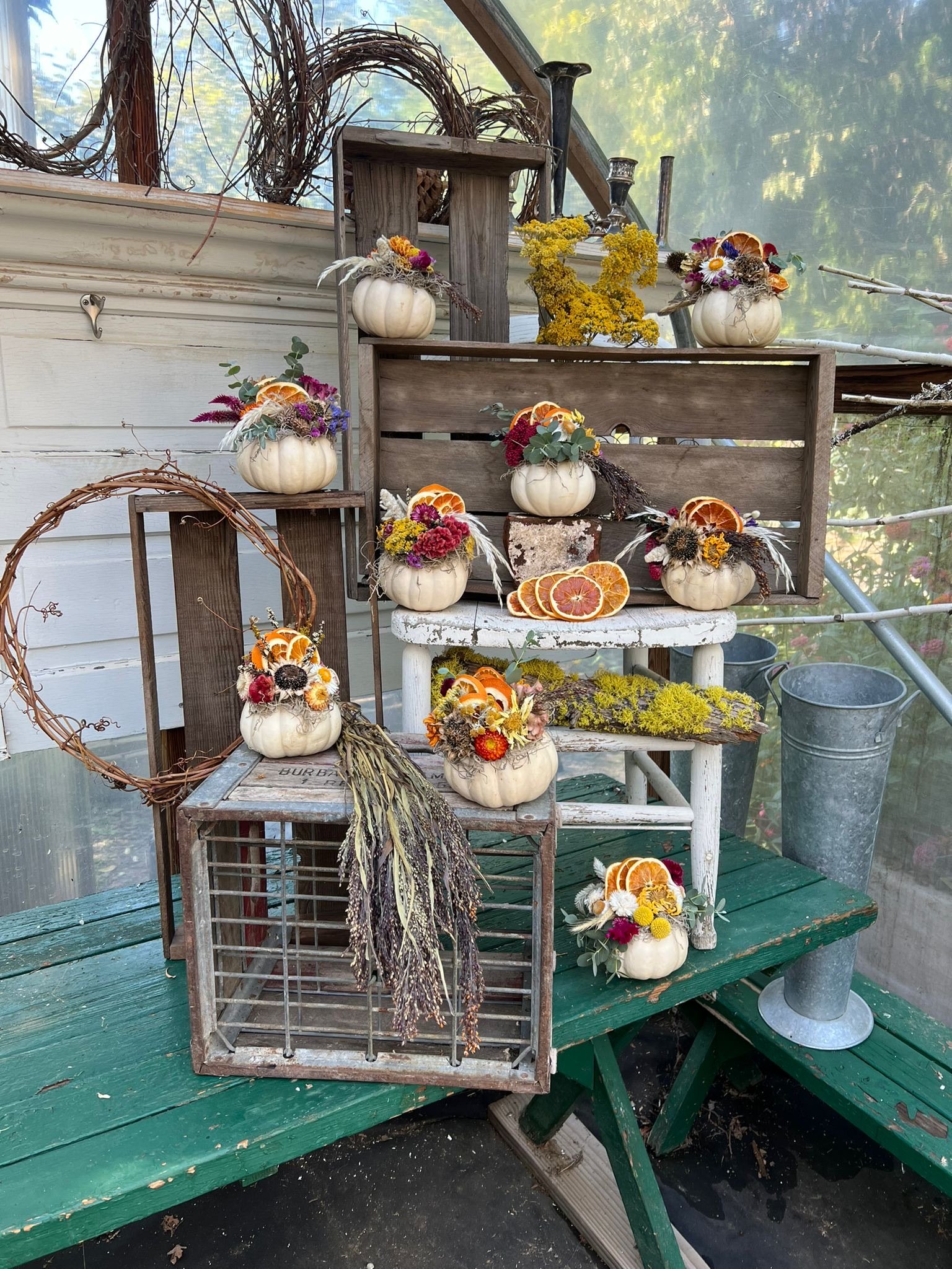 Each pumpkin is crafted from real pumpkins, adorned with a stunning, handmade arrangement of dried flowers that celebrates the beauty of nature. No two pieces are alike, ensuring that your Harvest Bloom Pumpkin is a unique masterpiece. Perfect for enhancing your seasonal decor, these pumpkins encapsulate the magic and energy of autumn, making them a wonderful addition to any space.